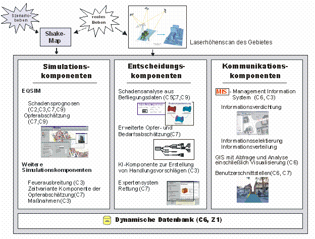 Sind Laserscanningdaten aus einer Befliegung verfügbar, erfolgt eine automatische Schadensanalyse, die für jedes einzelne geschädigte Gebäude erwartete Schadenstypen und die Opferzahlen liefert. Hierzu ist das geometriebasierte Opferabschätzungsmodell notwendig. Die Schadenssituation ergibt sich aus diesen und einer Vielzahl weiterer Beobachtungen, die in der zentralen Datenbank hinterlegt werden und von allen Komponenten genutzt werden können. Sekundärkatastrophen werden am Beispiel der Feuerausbreitung berücksichtigt. Die Feuerausbreitung kann unter Verwendung der vorhandene Informationen über den Gebäudebestand in Abhängigkeit geplanter Löschmaßnahmen simuliert werden. Auch die Simulation von Entscheidungen im Katastrophenstab, die die Ressourcenzuordnung beinhalten, ist möglich. Die technische Einsatzleitung, die mit den Rettungsmaßnahmen zur Befreiung Verschütteter aus eingestürzten Gebäuden betraut sind, wird durch ein Expertensystem unterstützt, das die vorhandenen Gebäudeinformationen nutzt. Die spezielle javabasierte Nutzerschnittstelle kann räumliche Informationen wie die Ergebnisse der Schadensprognoserechungen oder die Position von Rettungsressourcen darstellen und auch versenden und unterstützt die Kommunikation mittels strukturierten Informationen über ein Meldesystem an Interessenten. Ein Augmented Reality System soll positionsabhängig Informationen in einer semitransparenten Datensichtbrille darstellen können.